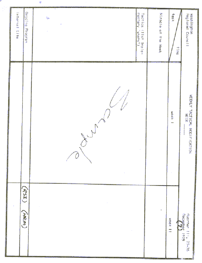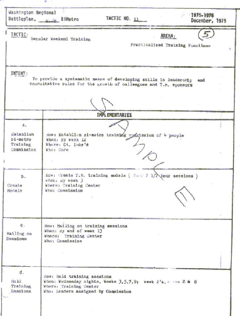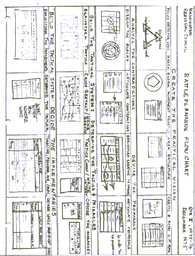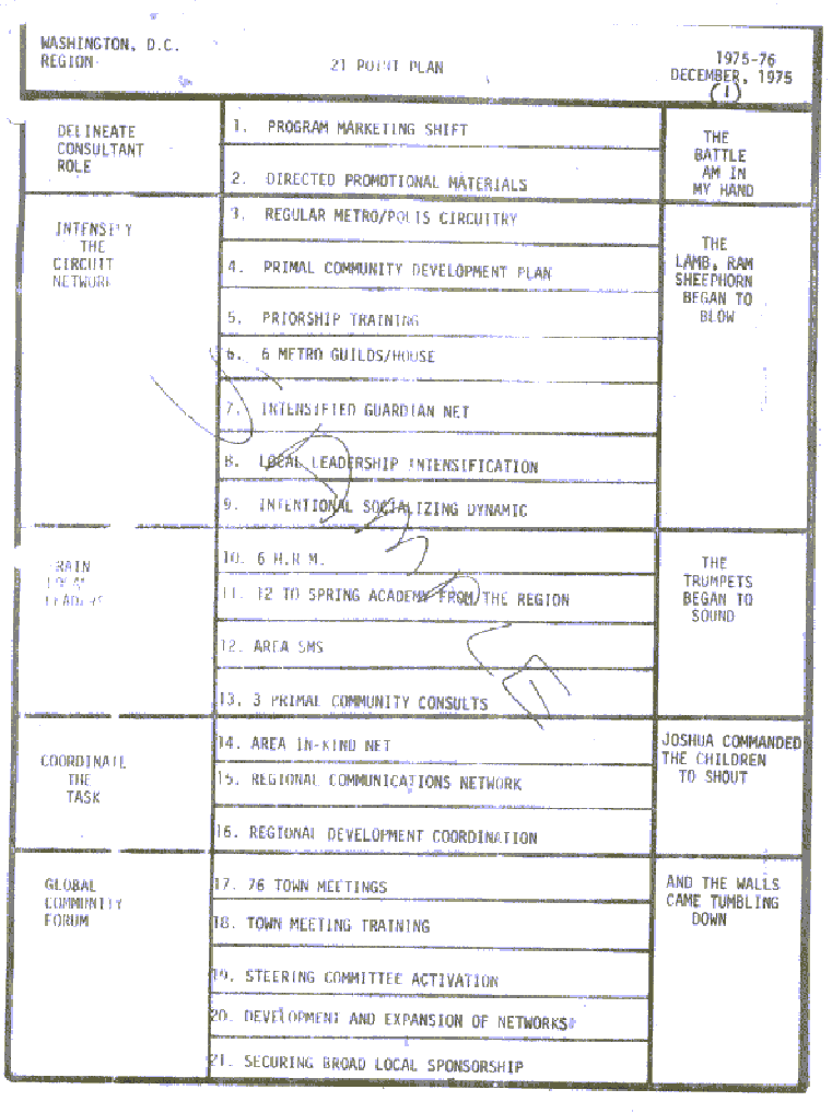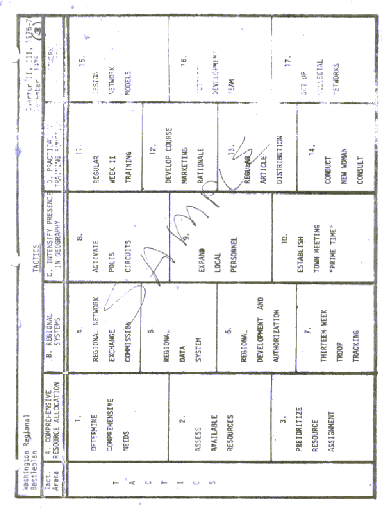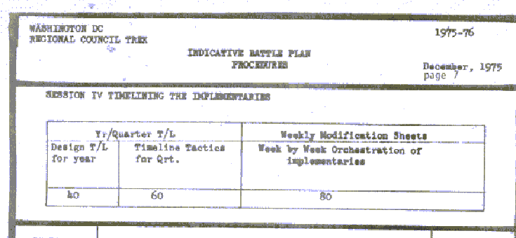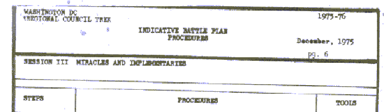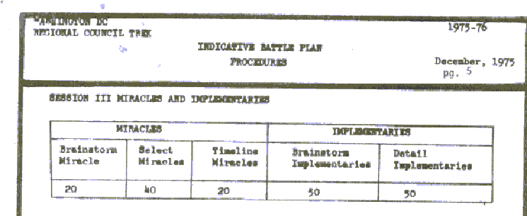 INTENT: To get us at any level of these five volunteer networks: Kiwanis, Jaycees, Lions, Methodist Church, and School Systems INDICATOR THAT MIRACLE HAS HAPPENED, When one person in one of these networks says "Yes, Town Meeting 76 will be our major bicentenial Project." |