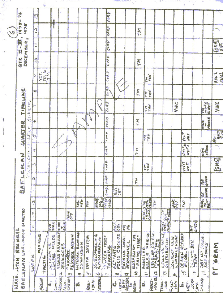 under each qtr. (see schedule.) Divide into Bi Metros Using the year time line as context, build weekly timeline for qtr. III (plus the rest of qtr. II) 1. Fill in miracles on a week/week basis, from previous work. 2. Fill in Programs, modifying where you sense it is necessary. 3. Using the data from the iimplementary charts, fill in tactica1 timeline.