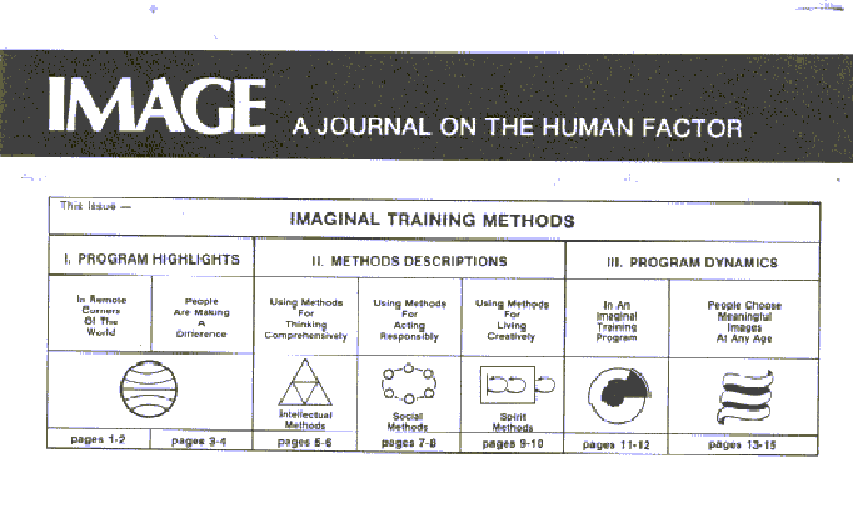 This issue of IMAGE describes a unique approach to the challenge of effective training experienced alike by the private, public and voluntary sectors of society. Basic principles of this approach, called Imaginal Education, are presented in order to encourage others to apply these methods in a variety of training situations.