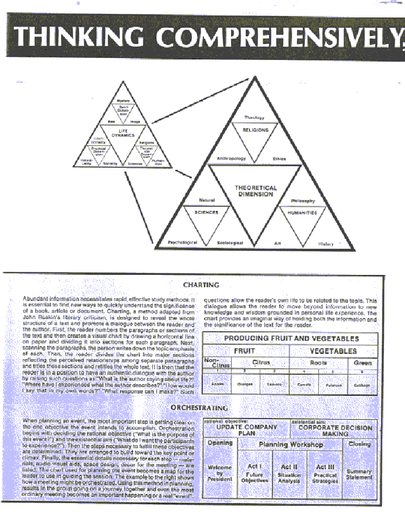 The Life Triangies represent one attempt to think comprehensively. They are the product of some of the intellectual methods which follow and are a tool for planning curriculum. They can be used to test the degree to which any course of study reflects the totality of life's experience. The social process triangles which were presented in the last issue of IMAGE are also a temporal model; they are meant to hold all available knowledge in relation to the dynamics of society.