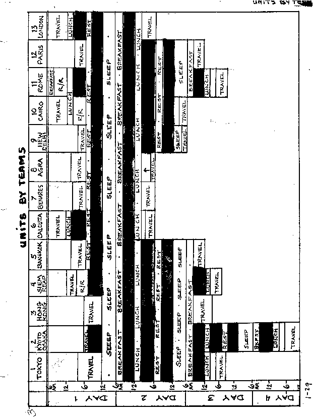 In Calcutta, the legendary city of India, we were hotelled in The Grand, where 1000 workers were digging a swimming pool by hand; where 100 men were on their hands and knees day and nite scrubbing the marble floors; where 25 crippled children stood at the entrance and begged, hanging on our arms. As we went through the lobby and on to the dining room, we heard the orchestra playing Glenn Miller music, drowning out the parades of protectors with Red Flags marching in the streets. After lunch as we found our rooms we could see through the windows people living on the sidewalks, urinating on the curbs, sitting in a crouched position, a~4sleeping.
