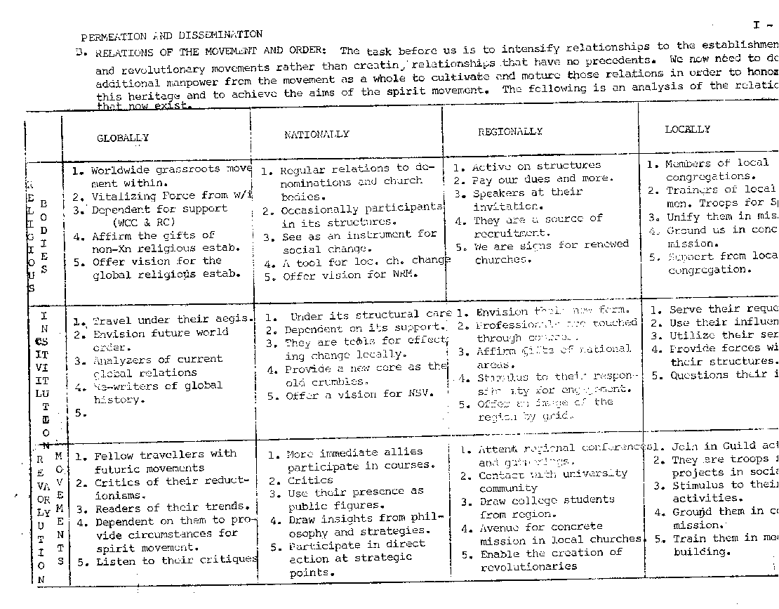 PROCESS | The vision of the Spirit Movement sees the Historical Church as the key symbolic institution that celebrates the drama of man's living his life as it is. The Church pushes man up against the mystery of his participation in all cultures. Further, man is seen as both creating and living out of his images. Therefore, the Vision sees the Church both as the inventor and the purveyor of these images. The contradiction within the Church has been its isolation from the real concerns and needs of the community. The demand upon the historical Church is to move from its protected position to one of exposure and engagement with the world. The primary image as "protector of social mores" must be changed to "creator of new human values". This new cosmopolitan image will embody the transformation from narrow parochialism to world citizen dealing `with all basic issues. The vision of the church as the key symbolic institution will be realized through the Signal project of reformulation ecclesiastical structures in three types of denominations Roman Catholic, United Church of Christ, and United Methodist. In order to actualize the global cultus, every local congregation cadre will enable its congregation to develop an ecumenical office. To insure the role of image creator, all ecumenical structures from local councils of churches to national and world bodies will be permeated in order to maintain their diversity within unity. In order to catalyze the global church, "Ur Heritage' courses will be developed for the six Ur areas and conducted in the international program. The process of permeation begins with the decision that it is the total Spirit Movement which will initiate and take responsibility for this direction. Consultations with experts provide a twoway communication so that Spirit Movement insights can be used ir7 institutions from the local through global level whole new insights are fed back into Movement structures. The impacting of structures so that they will be enabled to perform their functions will be done through strategic deployment of Movement resources. Sustenance within permeated structures will be empowered through accountability to the continual demand to be comprehensive and futuric in executing responsibilities. |