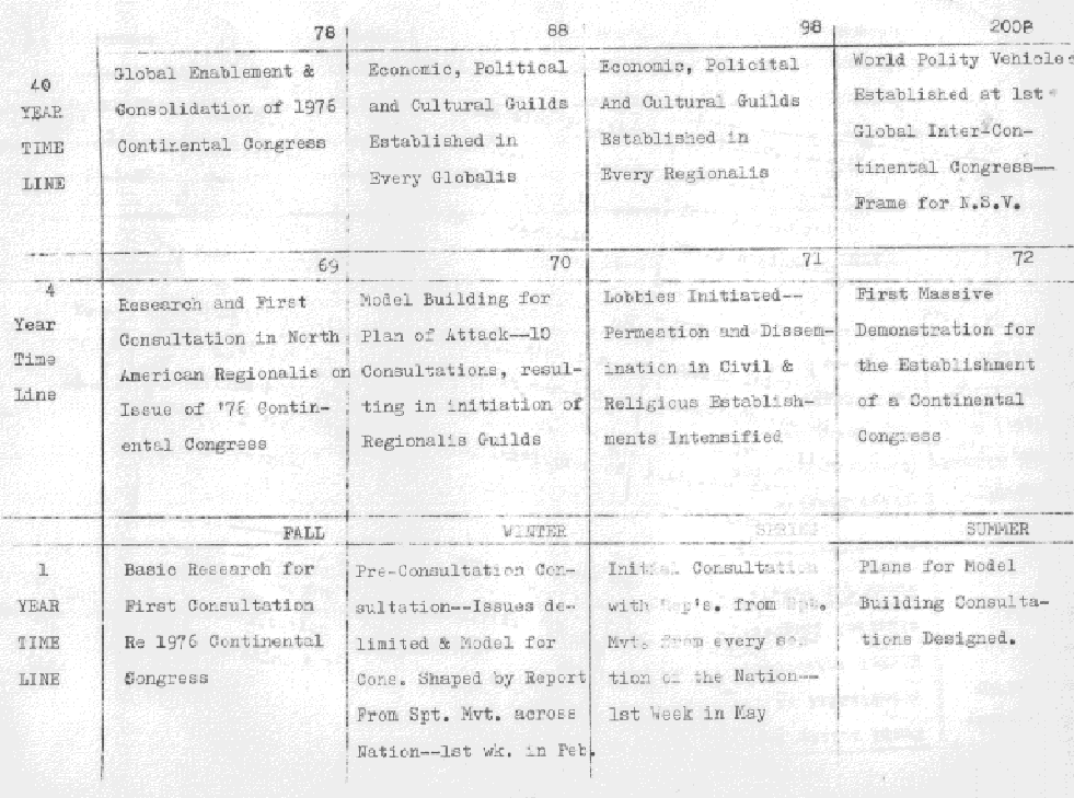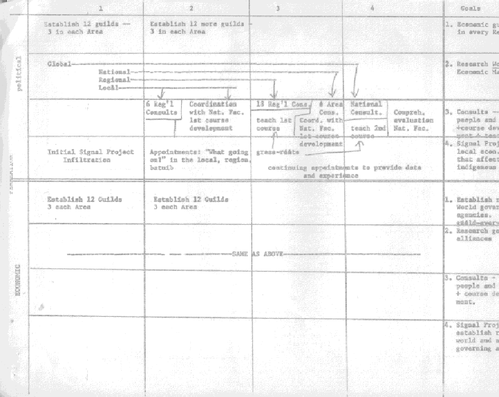 The strategic goals which must be the concern of the movement in the next four Years are 1) Research in International market trends, 2) one economic guild to be established in each region, 3) Consults on economics with professional groups to reimage our value system and appropriate development of courses and pedagogues and 4) a signal economic project in each region to challenge and explode this value system. To accomplish these goals, appropriate guilds must be gradually established over the next four years. Consults must be recruited for and scheduled and subsequent courses must be developed with pedagogy models built. Models for researching the world economic market must also be constructed. Finally the regional or local criteria for establishing economic signal projects must be decided upon, and actual plans must be made in relation to the circumstances and needs of the area selected. |