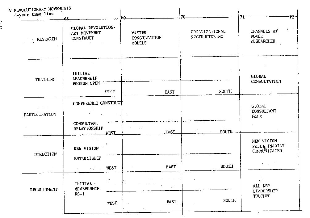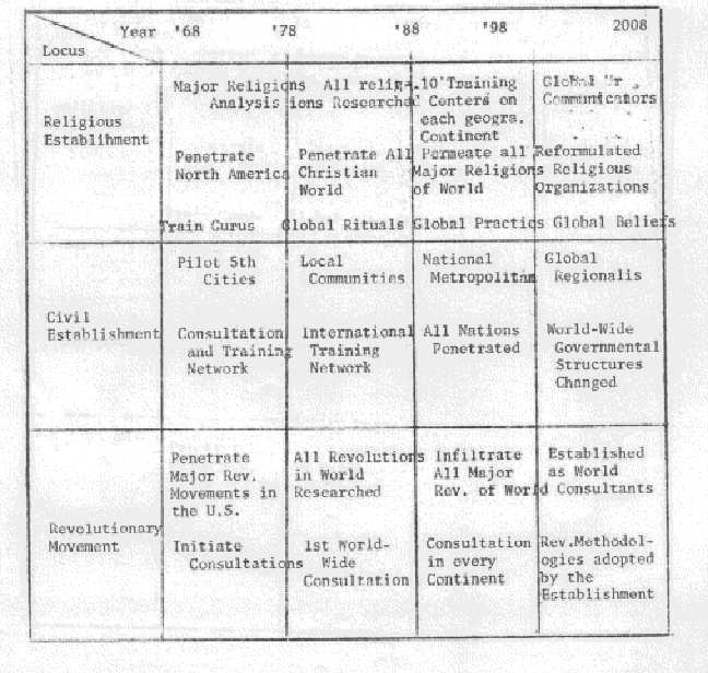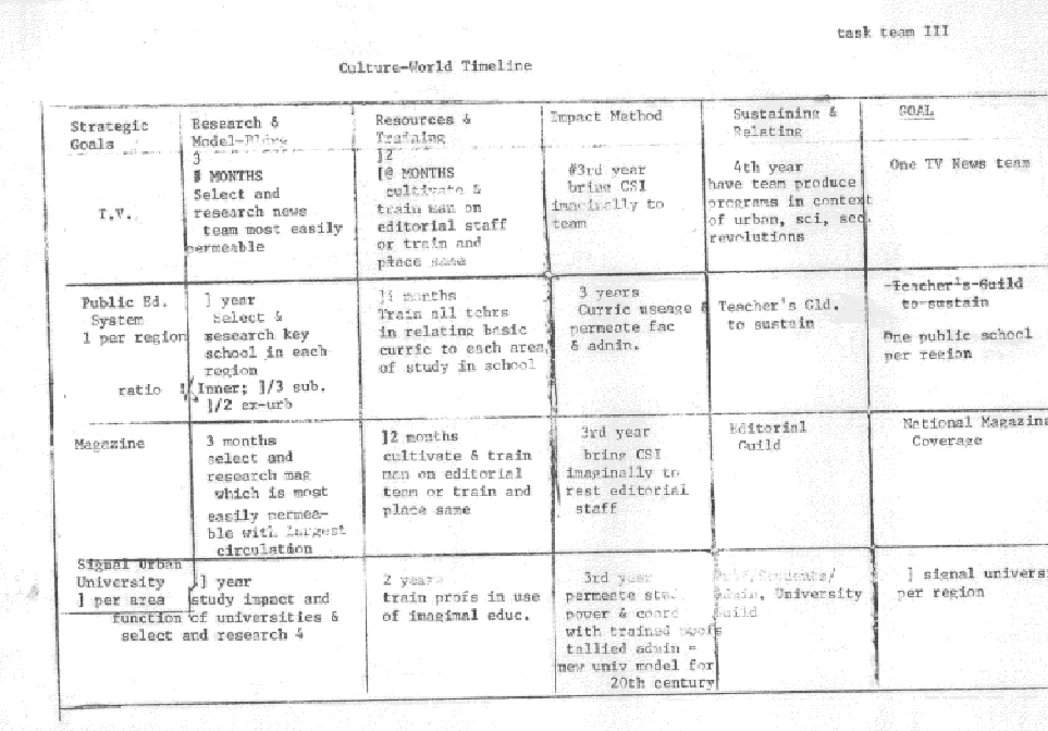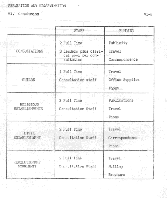 The key presupposition underlying the creation of the envisioned global civilization is the pervasive importance of images and symbols in determining the appropriation of humanness. The basic contradiction in the cultural dimension is that the primary images and symbols convey humanness solely in terms of the bourgeois life style and consciousness. Therefore, the permeation of those cultural institutions and structures which are the worldwide image molders and purveyors is the basic strategy of the Spirit Movement in transforming the social vehicle. Because public education and the mass media are the major symbol and inane purveyors which can be practically touched by Spirit Movement resources, they arc the most crucial structures to be influenced in the next four years. As a beginning in the process of transformation of the basic images and bourgeois style out of which the world's masses either live or aspire to9 the permeation of public education and mass media structures is a crucial issue for the Spirit Movement. As a signal, one special productions team of a major TV network must be given the tools and insights which will produce a continuing, monthly series of programs which convey the comprehensive vision of humanness. At the grassroots level the permeation of one public education system, including Board of Education, in each region must be accomplished in the next four years. Nationwide, a signal University operating out of a comprehensive, futuric and intentional vision of education must be raised as a signal to the globe. In order to effect a degree of permeation in the hone, a national magazine shall be permeated to the degree that editorial policy is transformed with a vision of the New Social Vehicle. The immediate task involves the gathering of pertinent data on the TV networks, national nagazine&9 regional public education systems, and Universities by the designated structures of the Spirit Movement. Utilizing model building, grids, and systems analysis techniques, decisions are made on which specific structures are to be permeated and the appropriate movement resources to be deployed. Actual "impact" on the structures w111 involve contacting key personnel within the structure, locating those allies and friends which can be recruited: to consults, specific workshops, courses and other inagina1 explosions in order to open to then the possibilities of global perspectives) in their specialties. If necessary, movement individuals nay temporarily enter the structure to influence a key position or strategically recruit personnel. The presence and style of movement people is an important tool especially in the public education systems and University. Finally, the permeated structures will require a sustaining relationship to movement structures during the transformation period. Such structures as guilds which nay enlist lucid individuals from the permeated systems will provide the continued education and comprehensive vision required. |