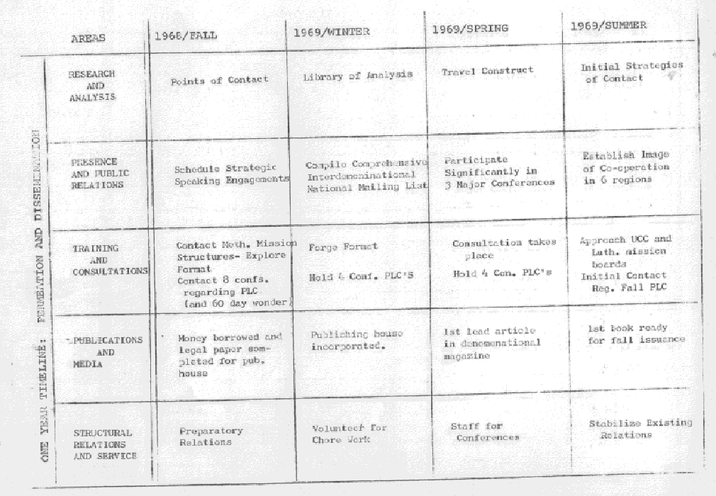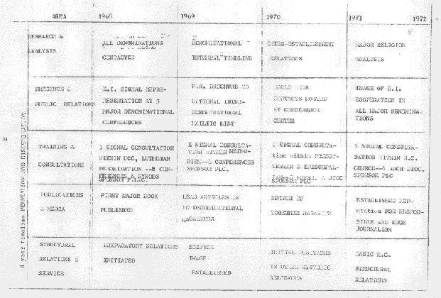 An obvious, strategic channel of penetration into the church establishment is the area of mass media and particularly printed media. To this point the thrust has been primarily through our publication and periodicals, This is still a valuable avenue, but it must be intensified and brought to a point of expertise. The present publication should be styled and written to broaden their appeal from a relative narrow base of primarily grads to a wider field of total denominational magnitude. In addition to our own publication use should be made of the ever increasing number of competent theological and church oriented publications. A portion of the creative writing power of staff should be directed toward impacting denominational and theological journals with first role lead articles reflecting and articulating the current edge struggle of the church establishment. The most remote area of penetration is the established structure of other major religious expressions. It might be that publications would be the logical and initial step in entering the area of "world religions,'. Many journals on Christian dialogue with other faiths are available to be used as a vehicle for penetration of these establishments.