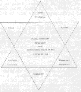 Now, the other triangle. Up in the left hand upper corner, put Skill. That is necessary in order to be effectively engaged in history. You don't have to be literate to have skills, and when you go to Maliwada, you better know that before hand. Those people are brighter than hell but they can't read their own name, let alone write it. And over on the right hand side, up at the top, put Nurture. Only as long as your profound awareness lasts can you be historically engaged. And if you do not take care of yourself, that profound awareness goes away. Nurture is life or death. It is what you do for yourself and what you do with one another. Down at the bottom, put the word Community. And I don't mean some organization; I mean the kind of community that never is confined to its own inflation. If you put a dot right in the front of that Star of David, and take your finger and start spinning it just as fast as you can, that is the Primal Community Experiment, tile new sociological shape of the People of God.