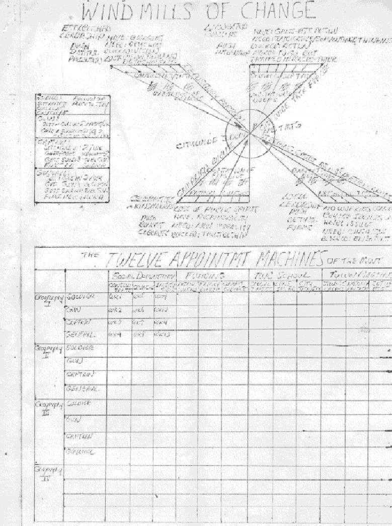 The following chart indicates the four Windmill arms of mission that can capture these people being blown by the winds of change in our time, and turn them into New Community on behalf of mankind picking up again responsibility for its destiny. To Local Leadership with Town Meeting we give them the means of consensus. To Liberated Groups with Special Town Meetings we give them the methods of indicative servanthood. To Established Leadership with Global Social Demonstration Consult and Repository participation we give them the means of authentic detachment and renewal of vision. To Kingmakers and Celebrities with Funding Campaigns we give them an authentic occasion for public engagement.