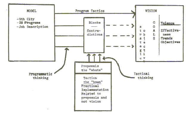 Next is the vision. Everybody has a vision of what has to take place. In other words, there is no such thing as a static model. It is always in the midst of a situation where something is happening. The way the vision is made dynamic is to set up priorities given by your vision. For example, you might ask yourself, "what now is being demanded? What is the most effective thing needed in the midst of our model here? What are the trends? What are the goals that lead to strategic objectives which would give you a kind of tactical relationship to the whole model?"