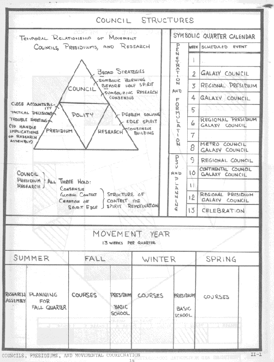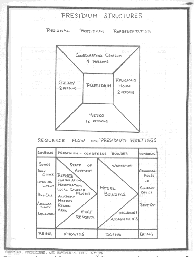In giving form to the Regionalis dynamic four structures are necessary to bring about and sustain the mission. The first, the catalyzing force, is that person or group that initiates the involvement of grads in planning and decision making. The second, the Regional Council, is the highly symbolic gathering of colleagues for the purpose of celebrating the past and consensing on the plans for the future. Out of this council is birthed the third structure, the Presidium, which is a small representational group that does the concrete ongoing planning and decision asking of the Region. The fourth, the Coordinating Centrum, maintains communication, and carries out the practical enablement of the Region.