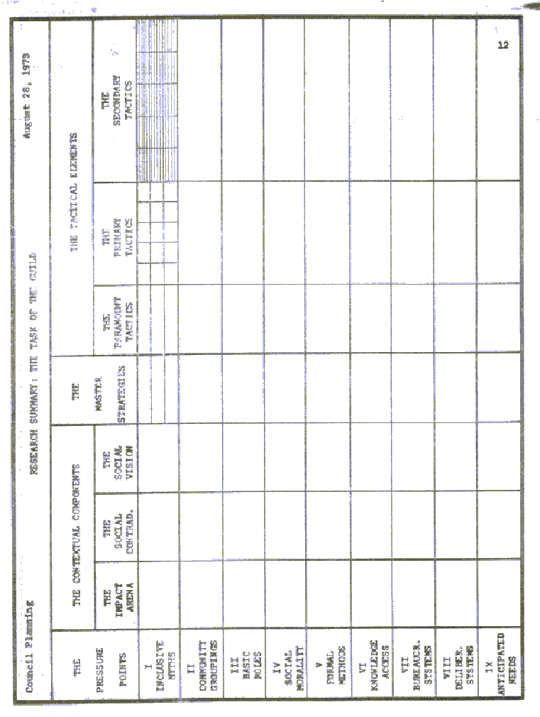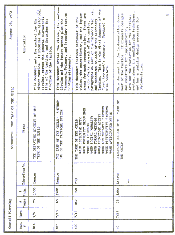 Thia document takes each one of the nine pressure pointa (Inclusivo Myth, Comaunity Groupinga, Basic Role~, Social Horality, Formal Mothods, Knowledge Accos6, Bureaucratic Syste~a,Dsllberativo Systema, and Antielpated Needa) and pulls out of tho Task of the Guild document th~ vision9 the contradiction, the impact arena, and the three 5x5 charts of tabtice. The vision, the contradiction, and the impact arena ~re d.~ecribed in the form using one primary component and four seocadary components The 5xS charts contain threeword phrases of the masterstrategy, the paramont tactic, the five primary tactics, and the twentyfive secondary tactice.
