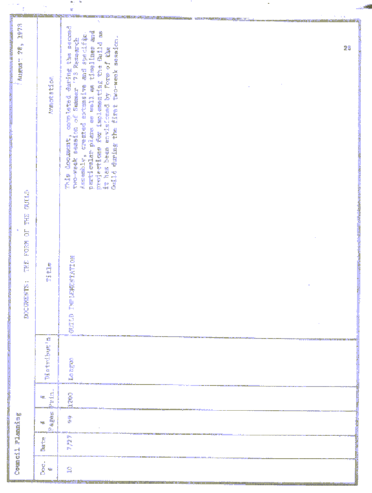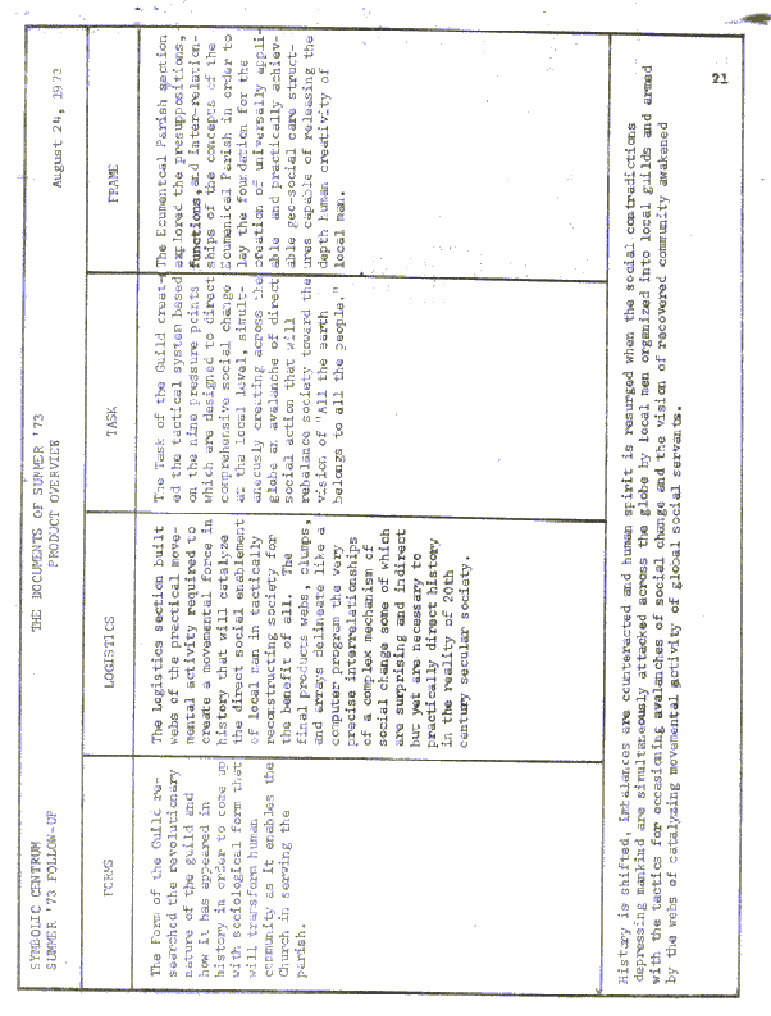 This document contains the major insights on the Ecumenical Parish as the Frame of the Guild gained in the Summer '73 first two weeks of research. It is a document of three parts.