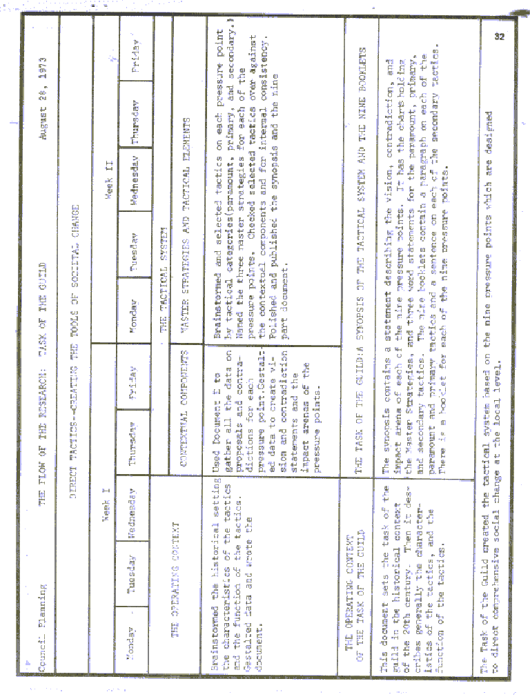mis document sets the context of the task of the guild by pointing to its practical setting in the times and amidst the people of the 20th oentury, by defining the characteriaties of a direct tantica system, ana by deaeribing the function of the direct tactics in total global revolution. The setting is that of human resurgence in the historical moment, of sociological manifestations in a time of resurgence, of hum*n response in time of resurgence, of the historical Church in a t£me of neaurgence, and of the primal guild in a time of resurgence. The eharaeteristies of the direct tactics are described as a coneretized vihian ~nd a particular mission. Also, the forces who are the systom., thQ impaetaren~a, and tactical action are described in the characteri~+ica as the global ~e~olution in the local commNnity, local revoluticn aa syato~atic care, a~aken
