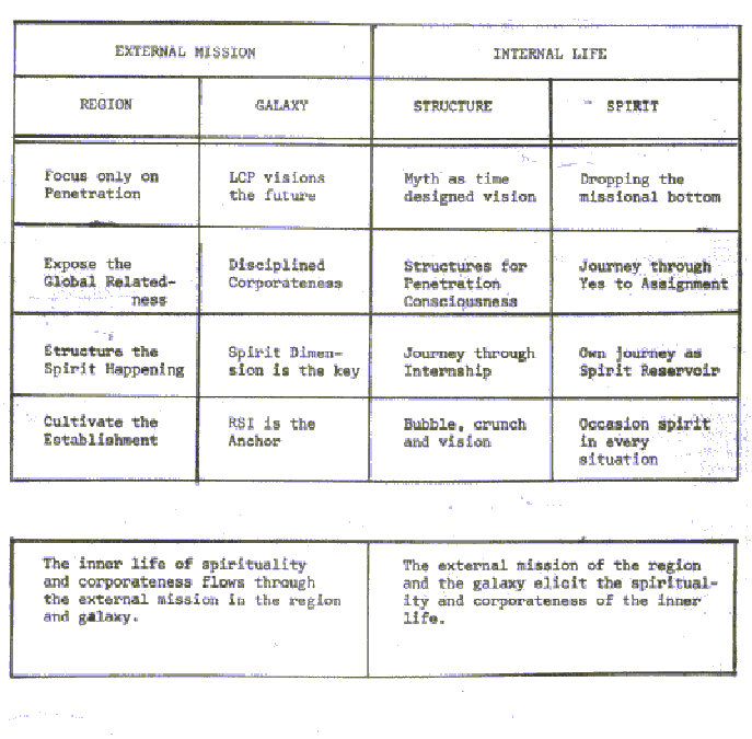 The third thing is structuring the spirit happening. Your regional structures have not the slightest concern with efficiency. They are only concerned with creating spirit consciousness within every human being, creating his greatness, his significance, his possibility to expend his one life, his possibility to celebrate his one pain. The attention that you pay to designing the structure of regional council that puts spirit into every minute of that council is a thousand times more important than any decision that that council makes. All the decisions are made in the presidium meeting the week before and are announced in the last five minutes of the council. The rest of the time is just sheer happening. We have played around with the ecclesiola format for the metro council. The metro council needs to deepen the spirit life and consciousness of those colleagues. It sings an hour, it studies an hour, it visions the future for an hour, and then it spends five minutes making decisions. After it has spent those three hours doing those three things, you can make all those decisions in five minutes because you have just swept away from the scene of history anything anybody would point at with the category "problem." That's how you keep Satan waiting for an opportunity.